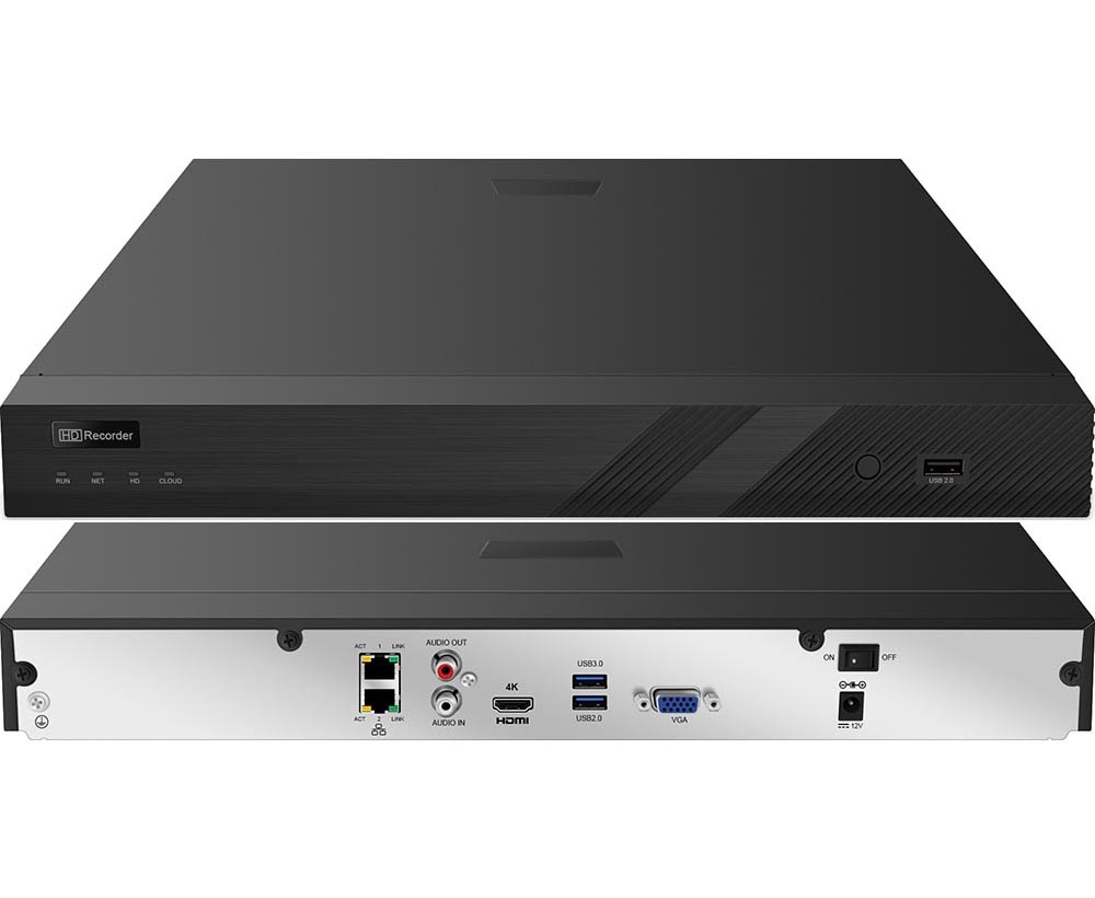 32 Channel NVR : Ultra 4K 8MP 3840×2160, 2x SATA, 160Mbps, H.265, ONVIF, RTSP, HDMI, VGA, USB, Audio, Phone App, No Fee Software, NDAA